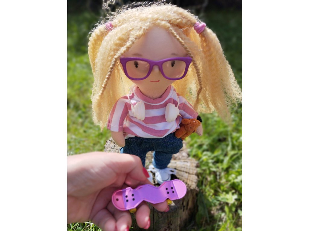 Tato panenka v oversize tričku a v moderních riflích s kapsami má pod ramenem volně vložený skateboard, kolem krku sluchátka s oblíbenou hudbou a v druhé kapse jako talisman je medvídek. Celý ouftit dokreslují brýle ...