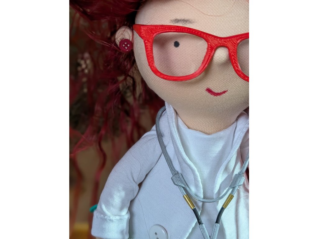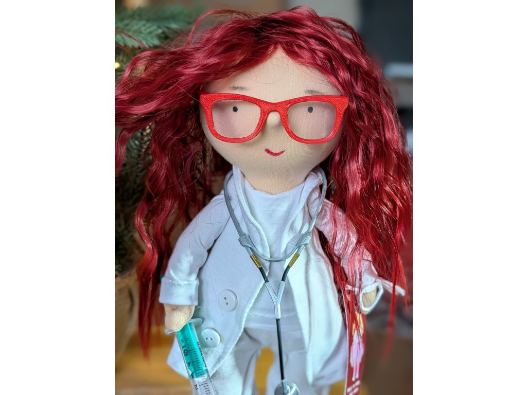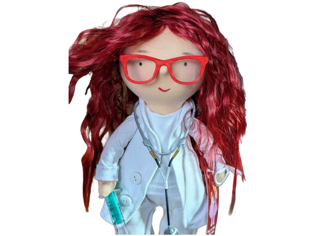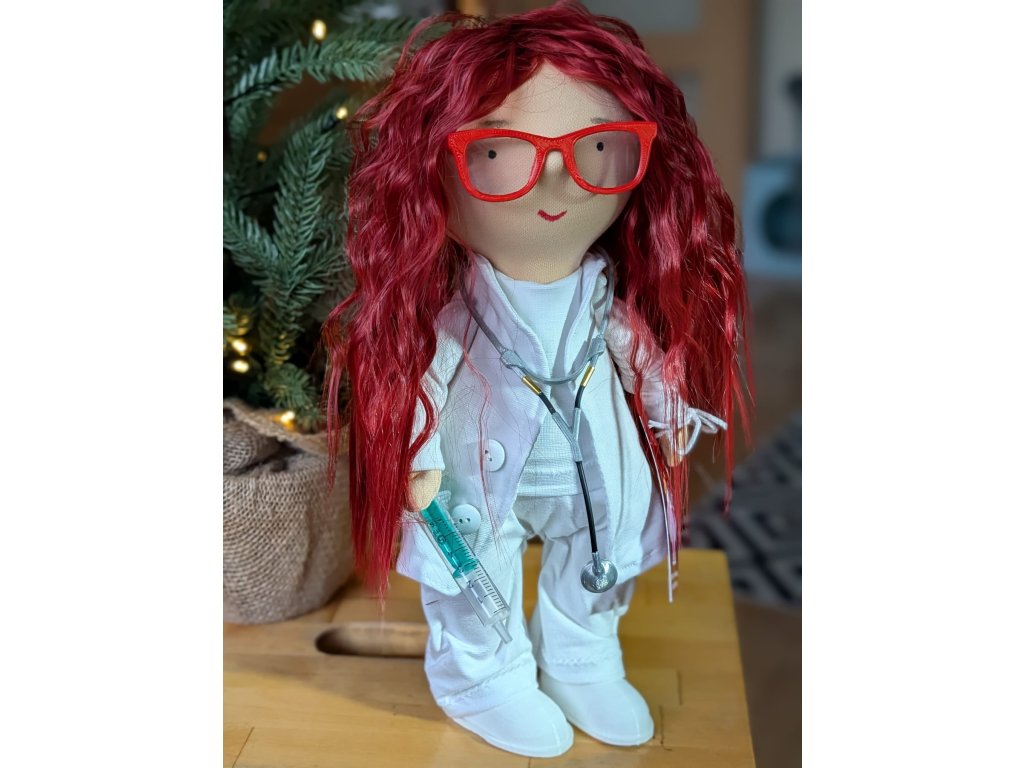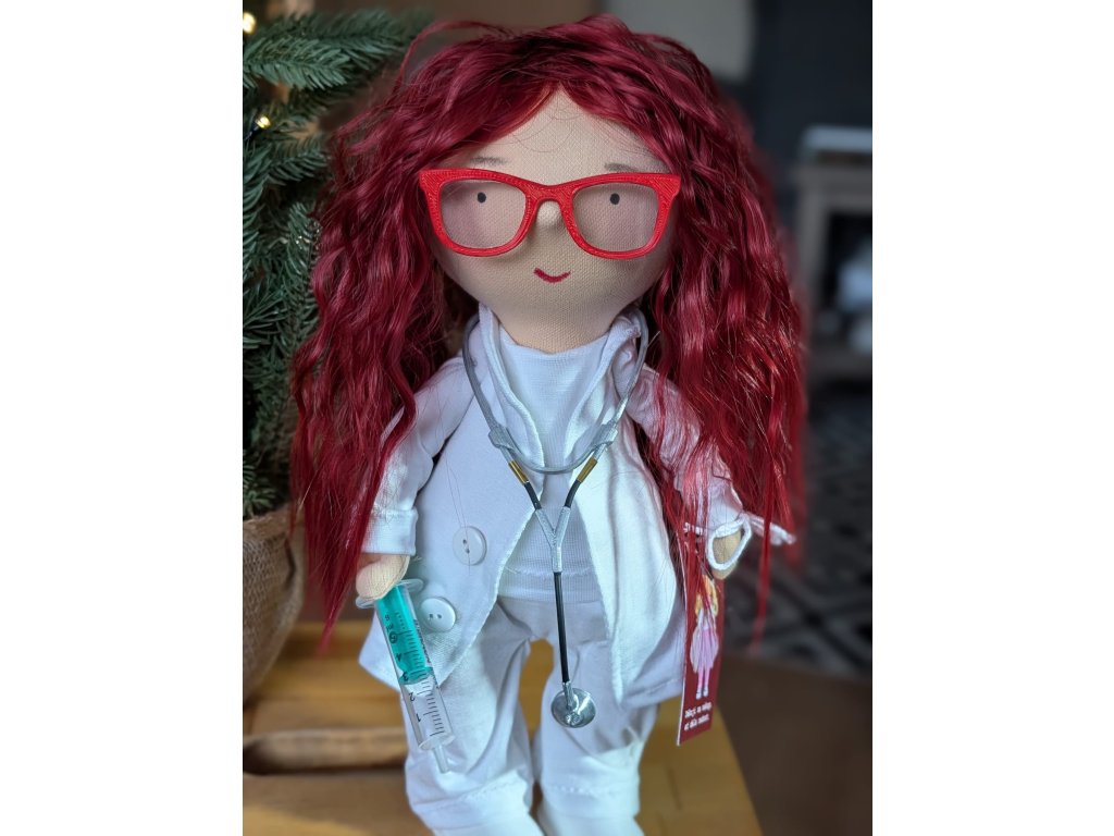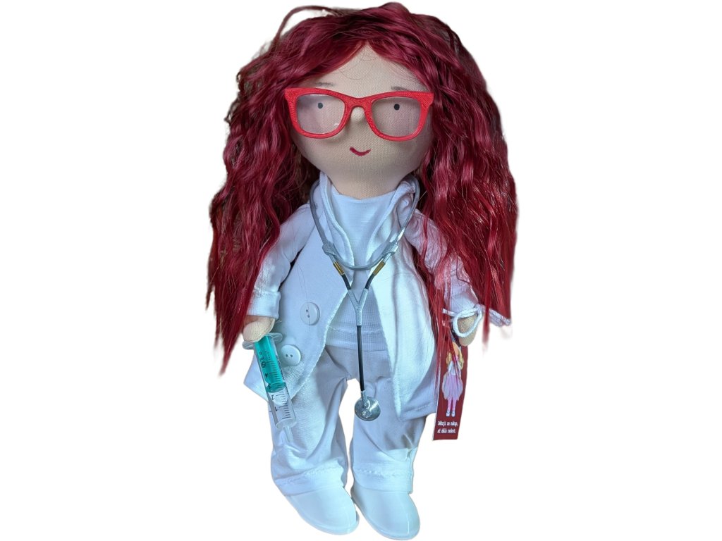 Tato panenka je cca 38 cm vysoká, je šitá z bavlněného úpletu a jedná se o dekorativní panenku vyrobenou do profese. V ruce drží injekční stříkačku a kolem krku má stetoskop, krásné dlouhé červené vlásky, ouška dozdobena naúšnicemi