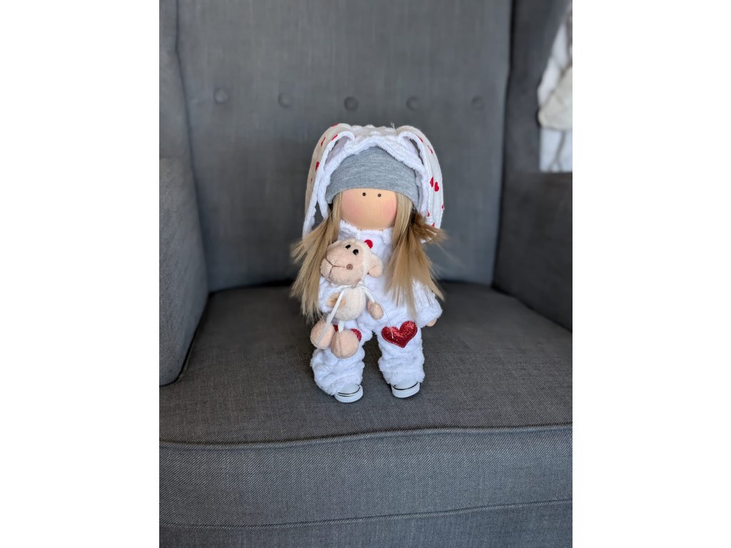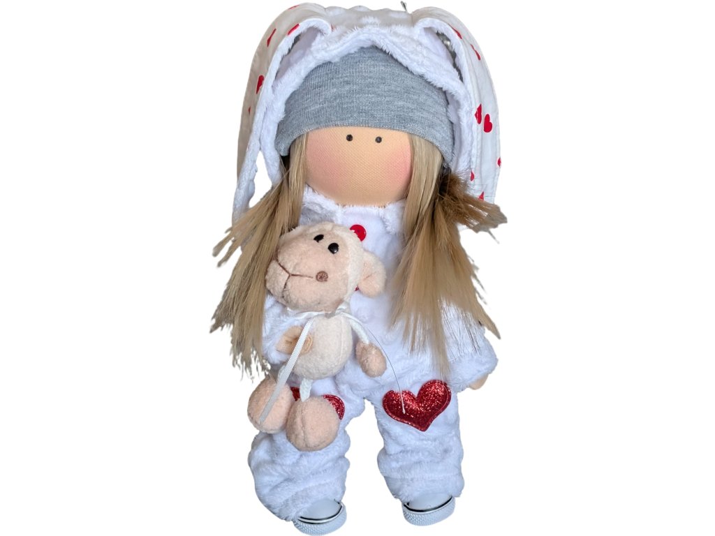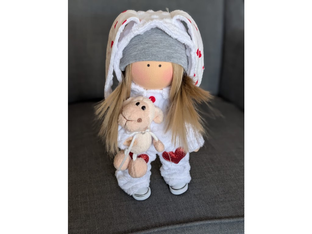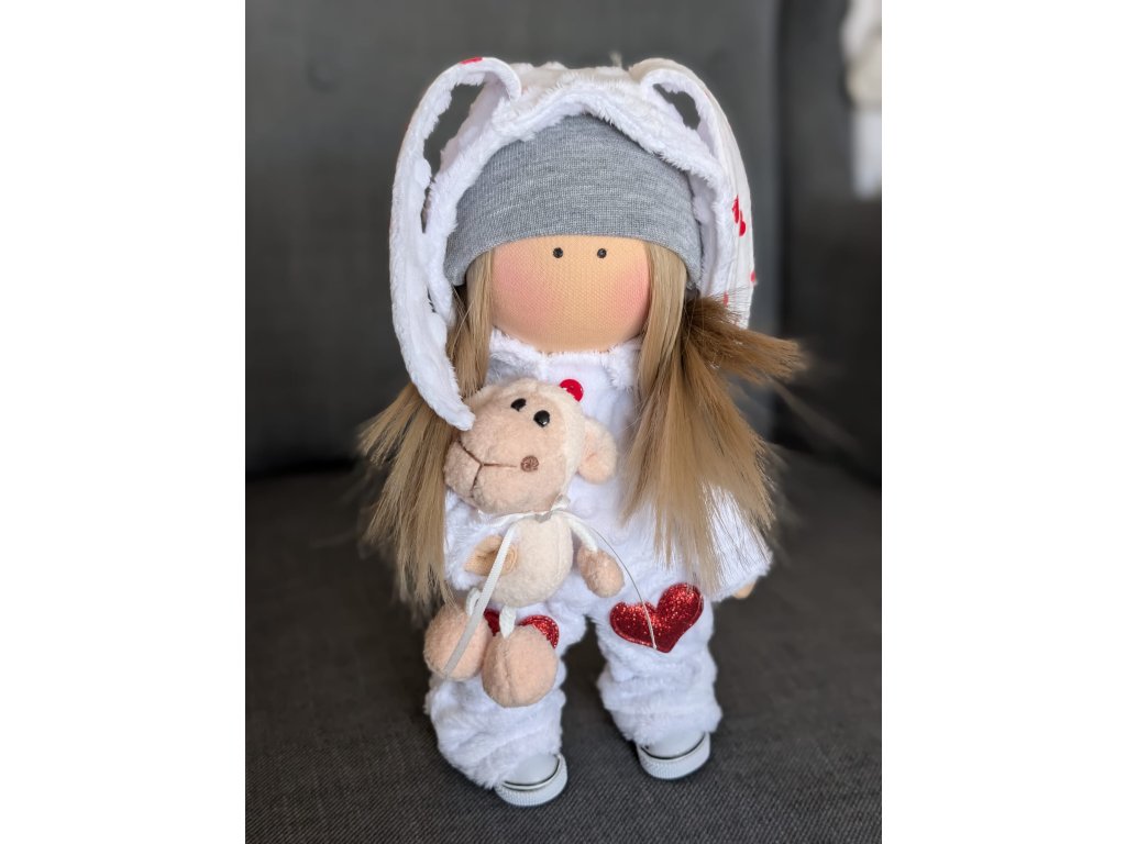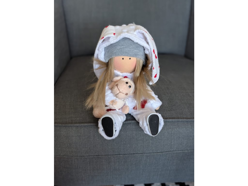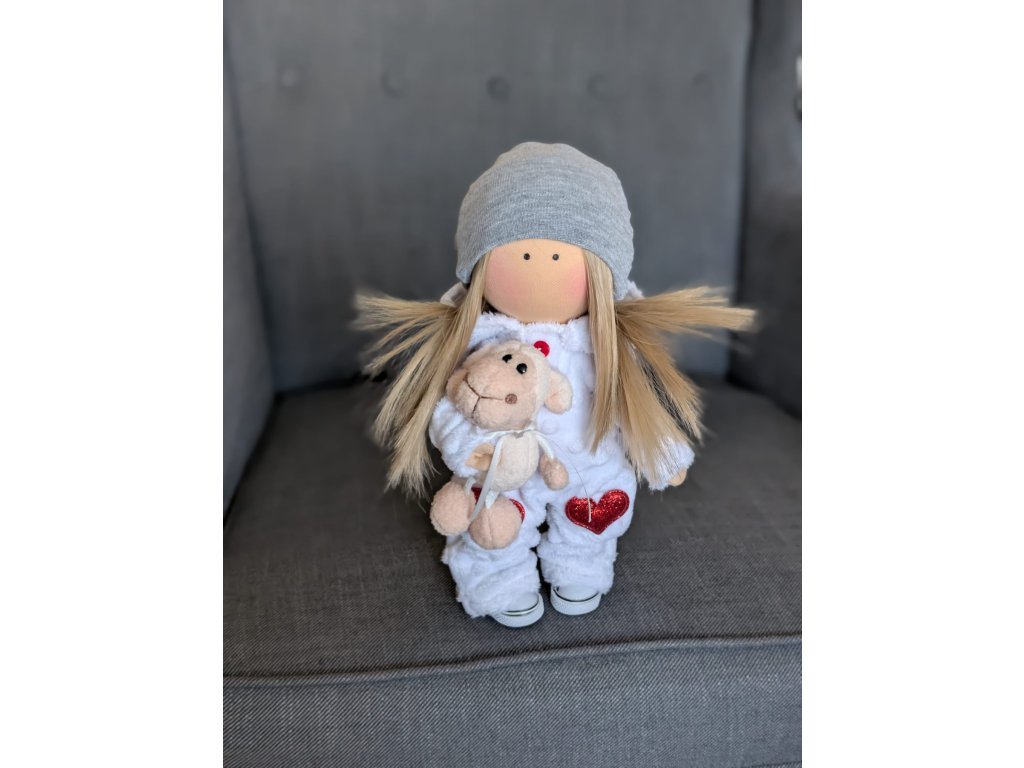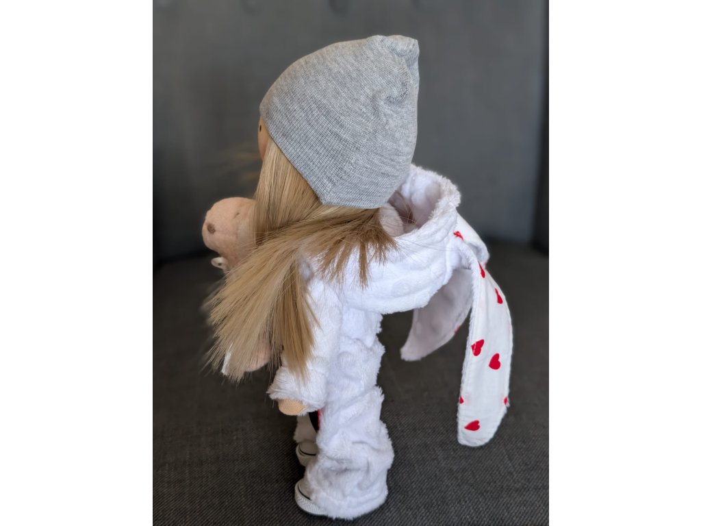 Zimní Nanynka ve střední velikosti (má cca 25 cm na výšku) oblečena do heboučkého overalku šitého z minky. Na hlavě má kapucku s oušky, kapucka i čepička se dá Nanynce sundat.