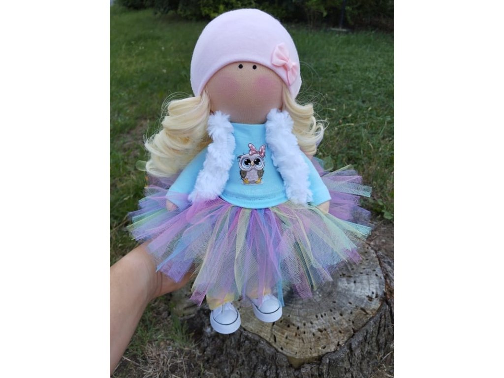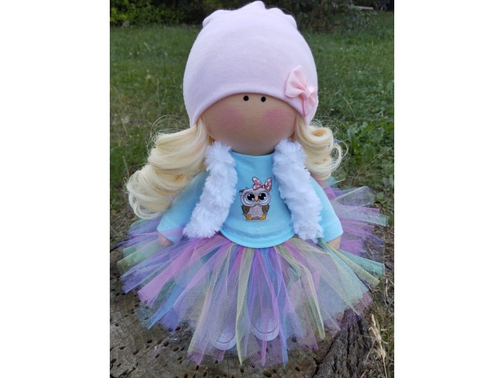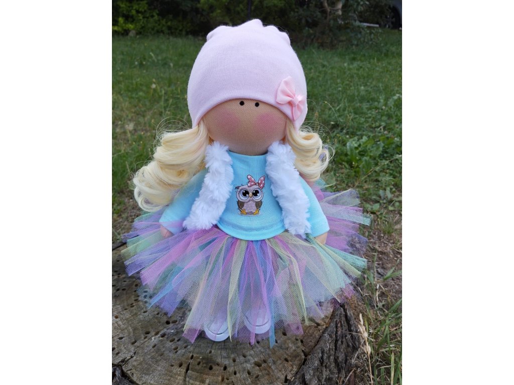 38 cm vysoká Nanynka v duhové sukénce s nažehlenou sovičkou na tričku a v chlupaté vestičce
