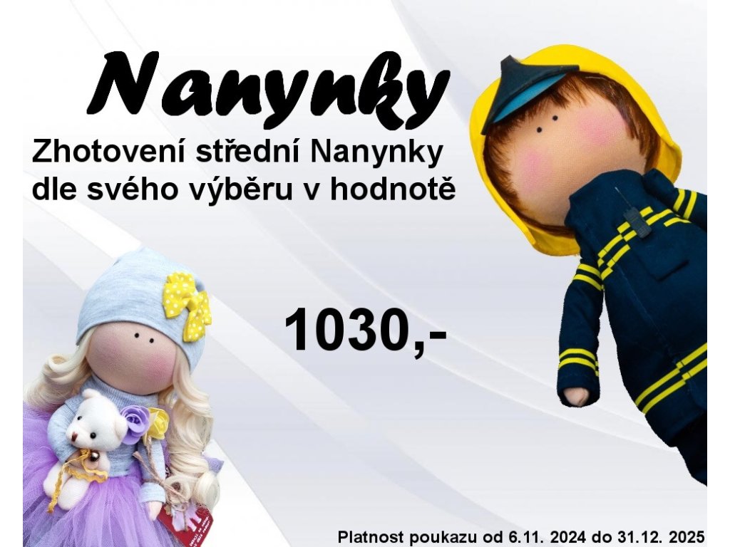 Dárkový poukaz na zhotovení střední Nanynky dle Vašeho výběru. Lze zaslat elektronicky či poštou, prosím při volbě zaslání elektronicky volte prosím "osobní odběr v Novém Boru"